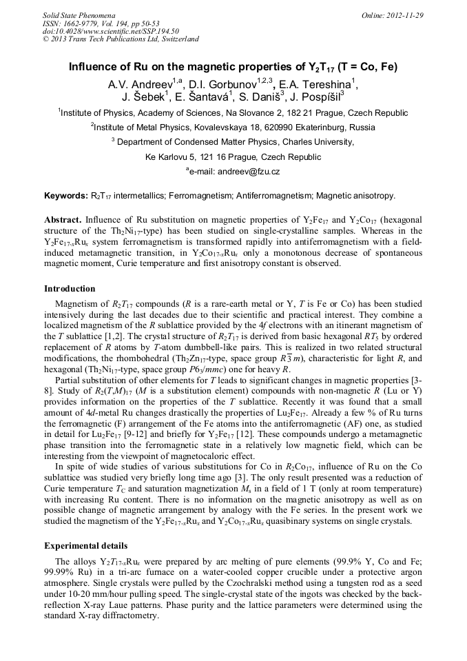 Influence Of Ru On The Magnetic Properties Of Y2t17 T Co Fe Scientific Net