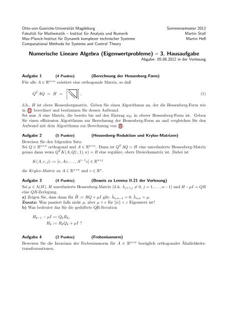 Numerische Lineare Algebra Eigenwertprobleme A 3 Hausaufgabe