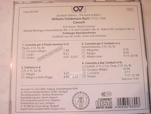 Wilhelm Friedemann Bach Concerti Karl Kaiser Traversflote Freiburger Barockorchester Wilhelm Friedemann Bach Gottfried Von Der Goltz Amazon De Musik